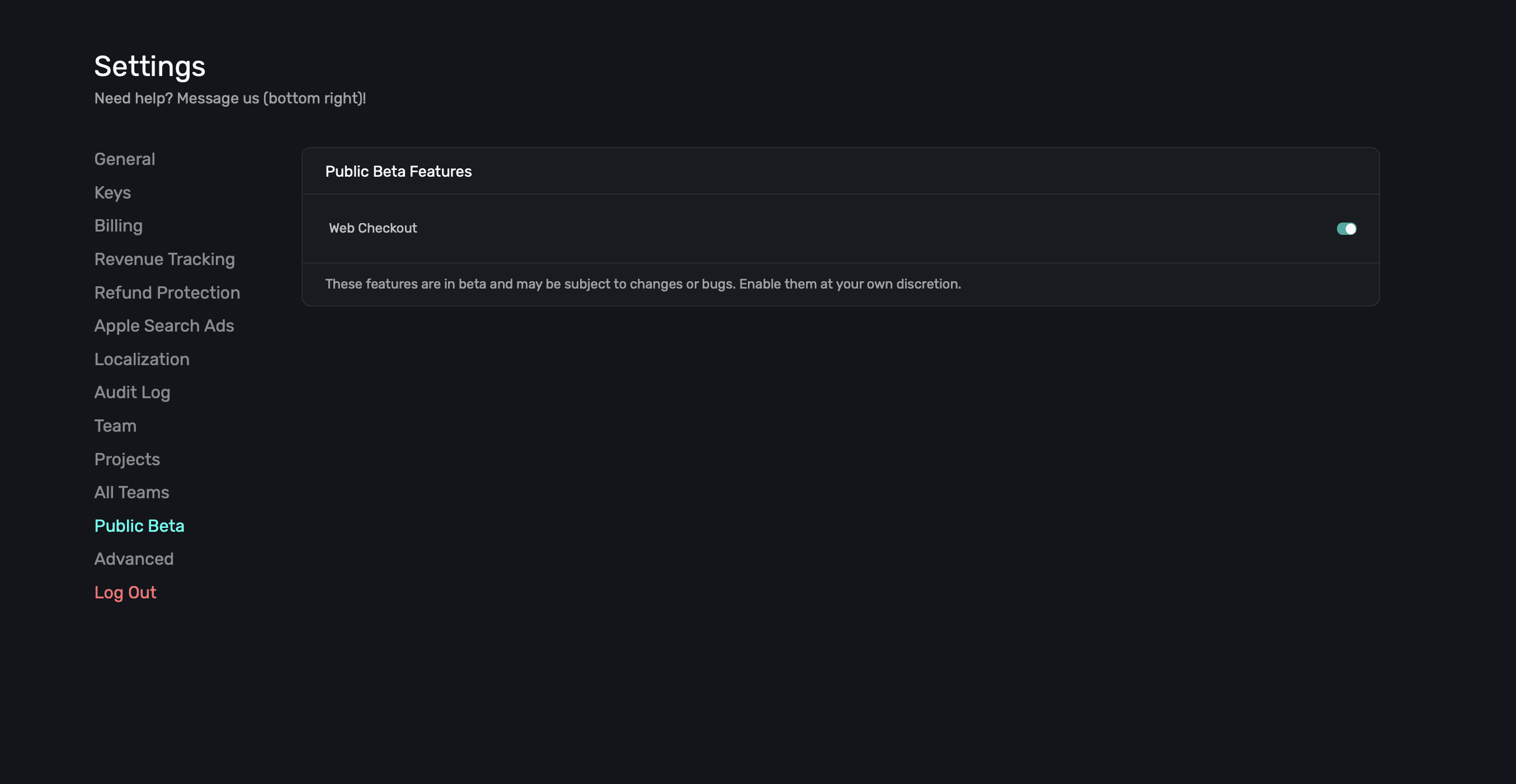 In the Public Beta section within Settings, you can opt-in to Superwall beta features: