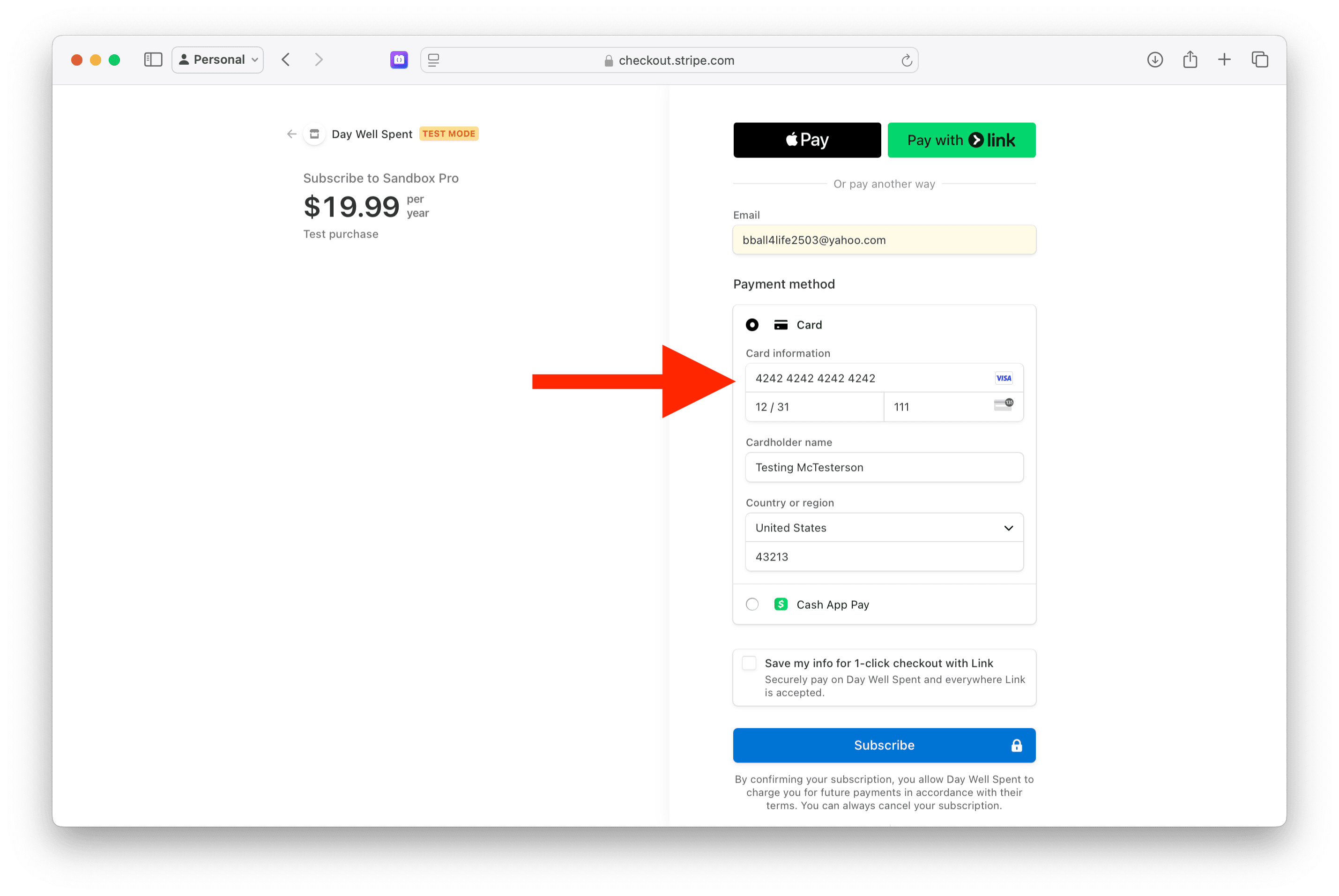 4. For the card number, use 4242 4242 4242 4242 with any expiration date later than today, any CVC and fill out the name and zip code.